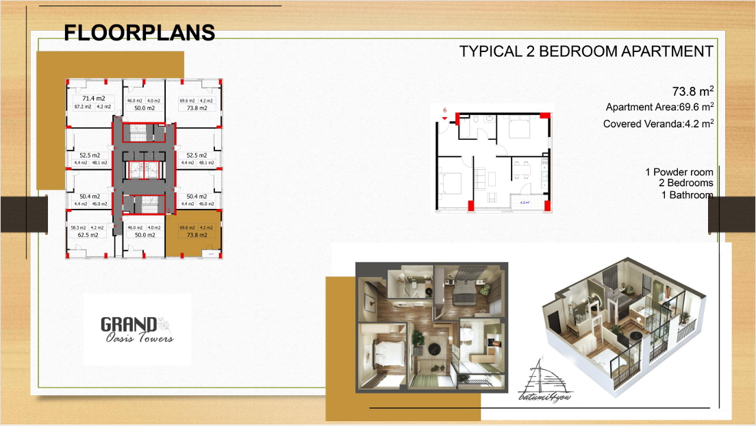 דירת שני חדרים, 69.6 מ"ר בנוי, מרפסת בגודל 4.2 מ"ר, חדר אמבטיה, חדר שינה הורים, חדר שינה אורחים וחדר שירותים.